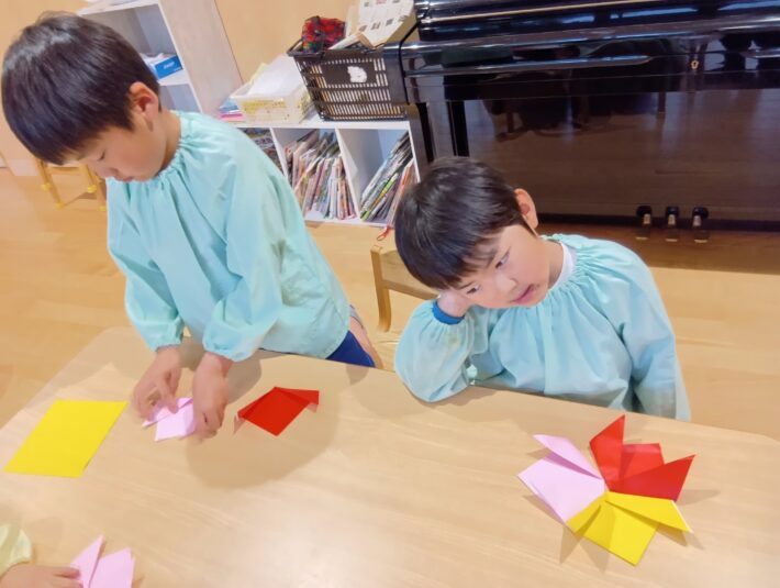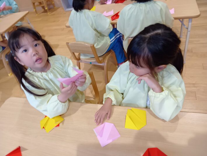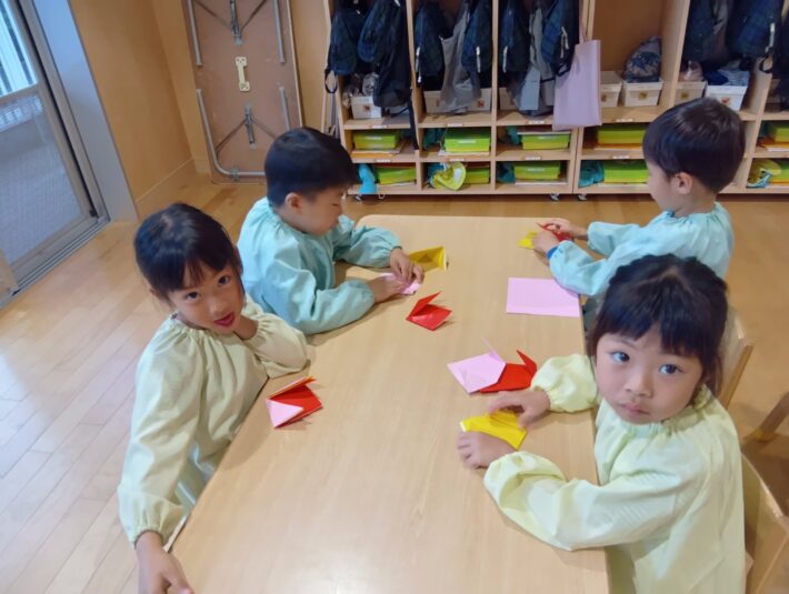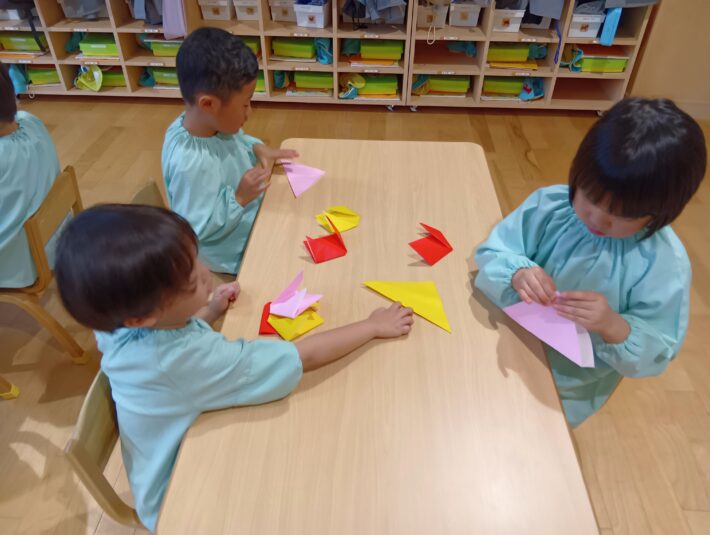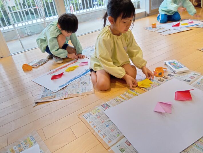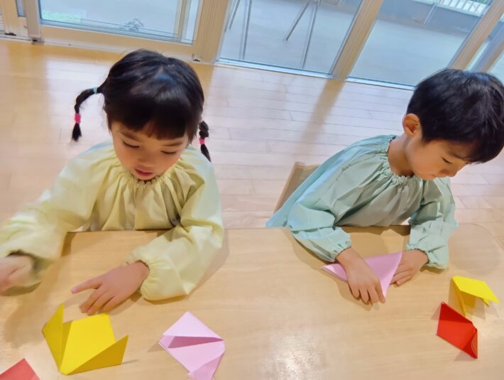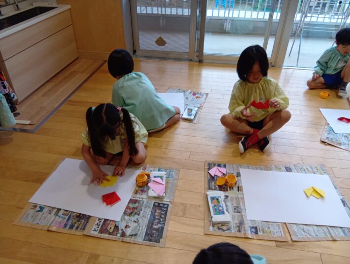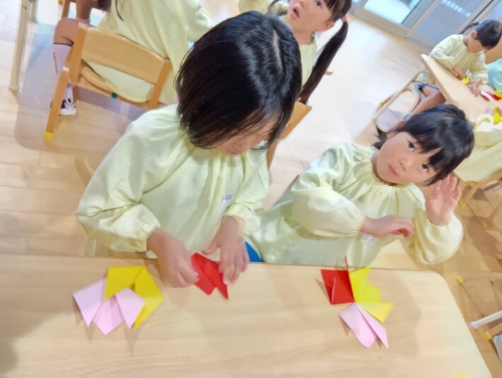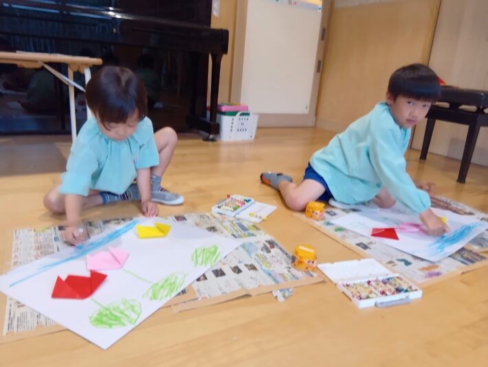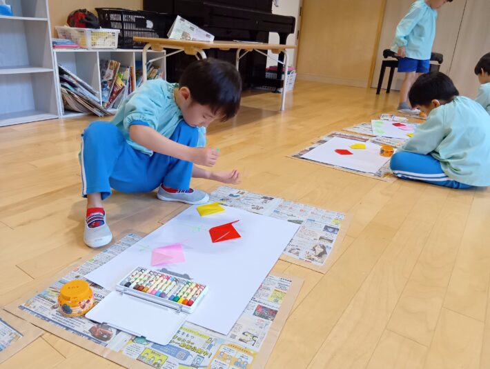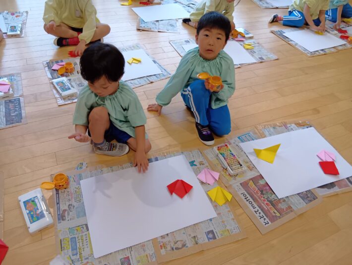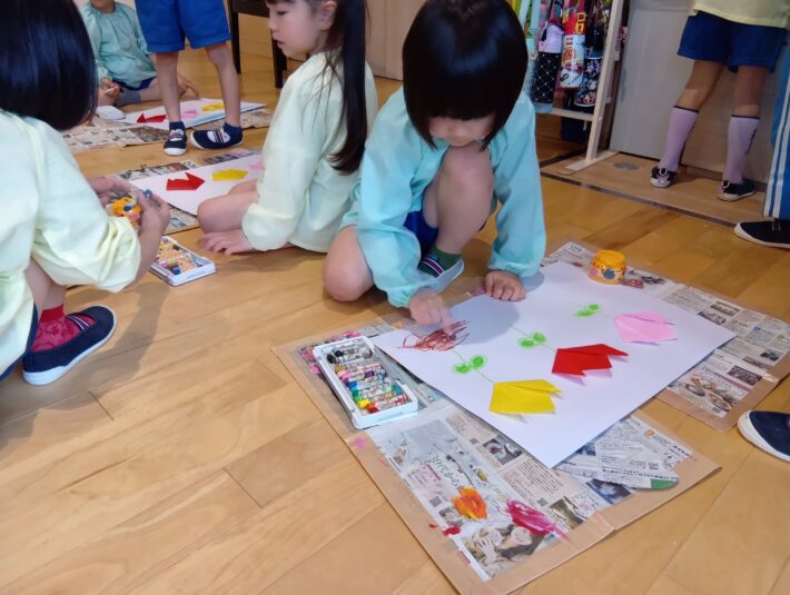 折ったちゅうりっぷを画用紙に貼り、葉っぱや空やちょうちょなどお絵描きも楽しみました!