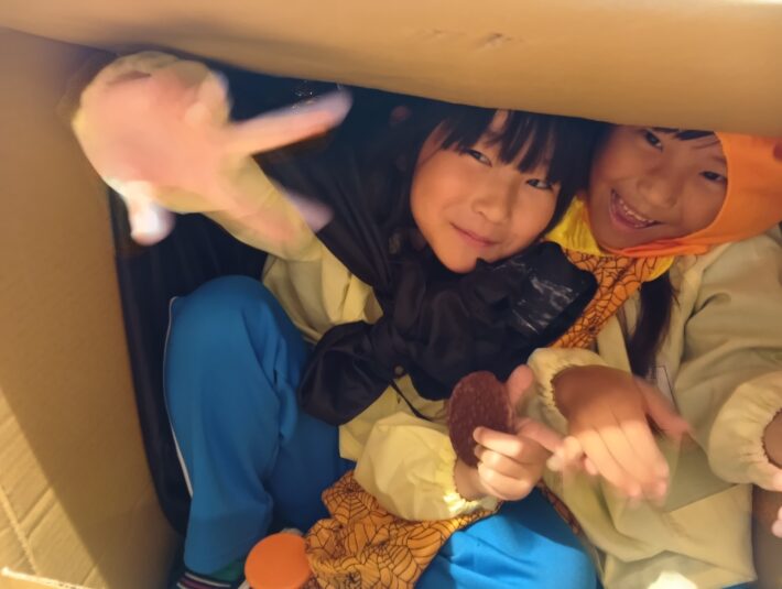 段ボールの中に隠れたり、お菓子作ったり、食べたり