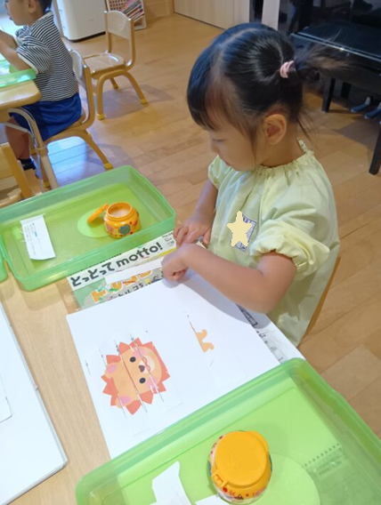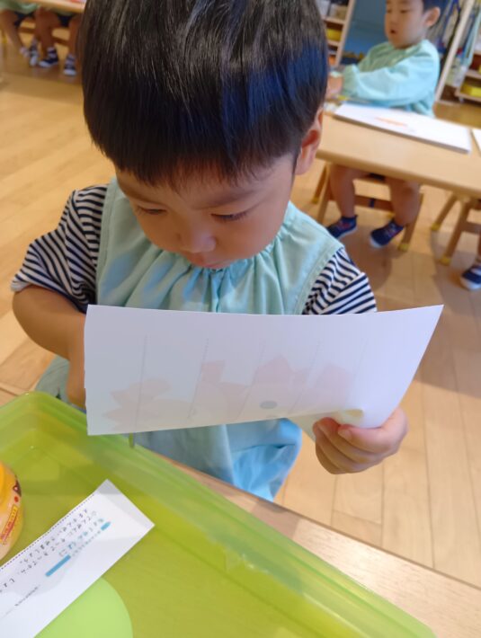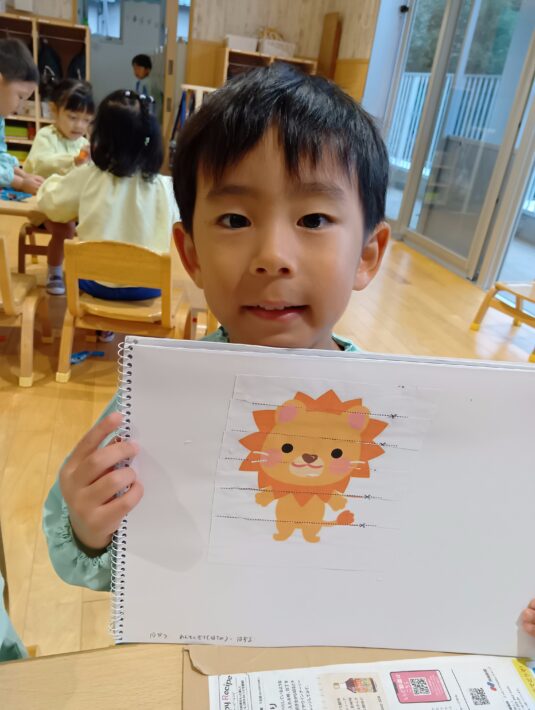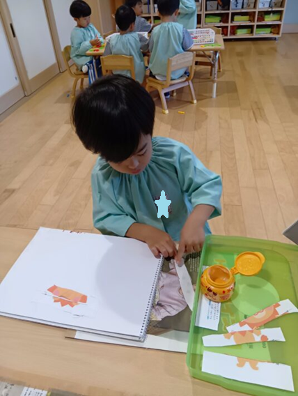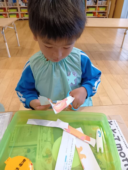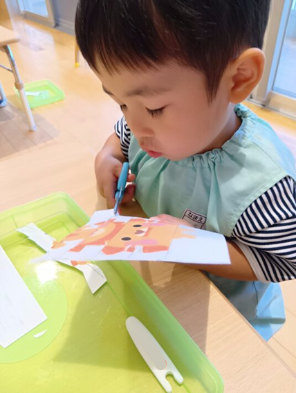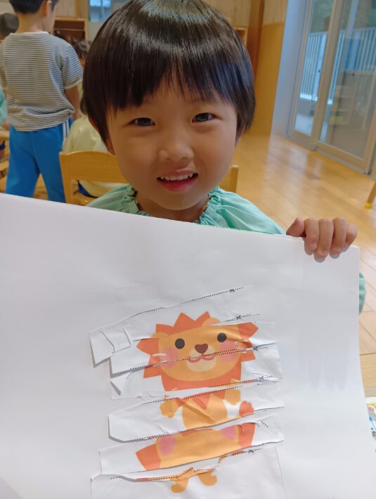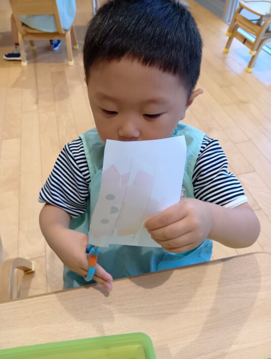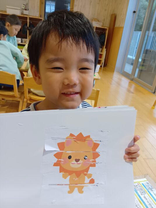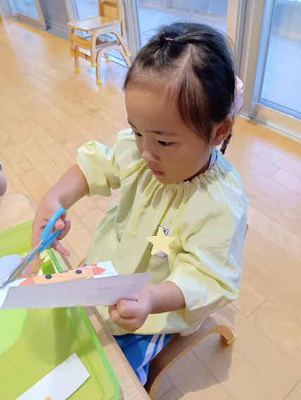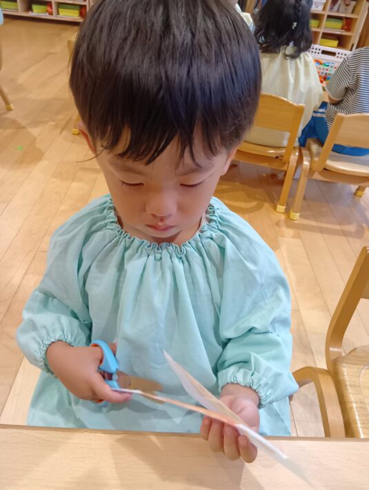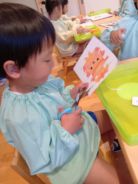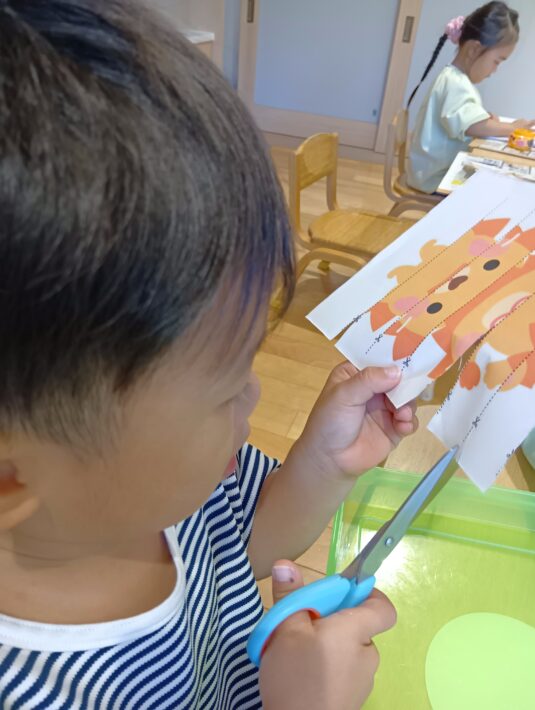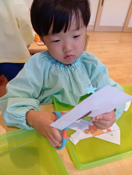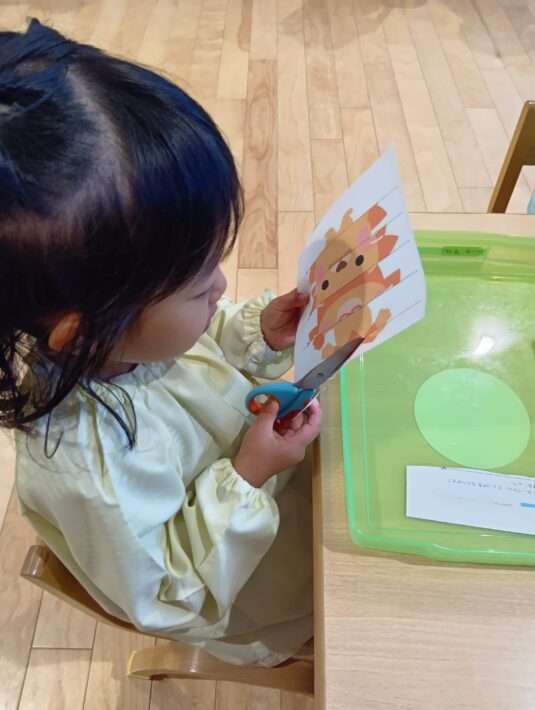 ハサミの持ち方、切る時の手や紙の向きなど、難しい中、切り取り線を意識して頑張って切っていましたよ✂