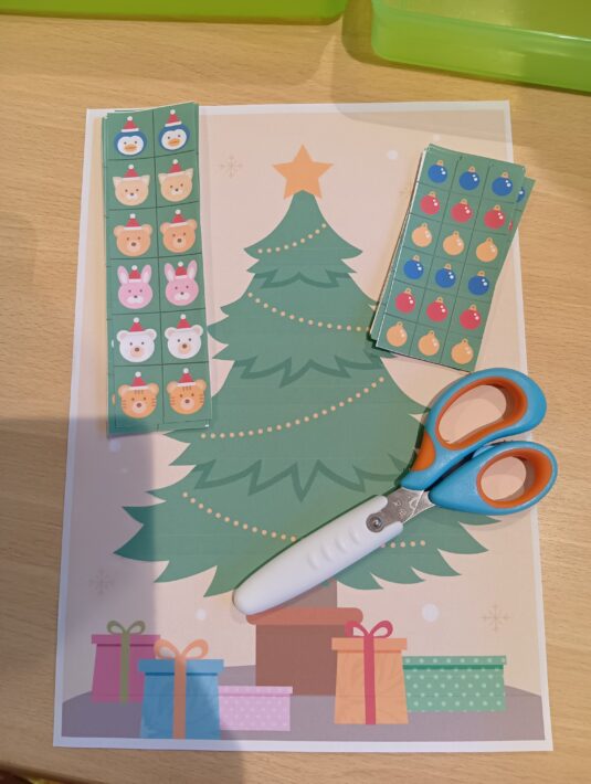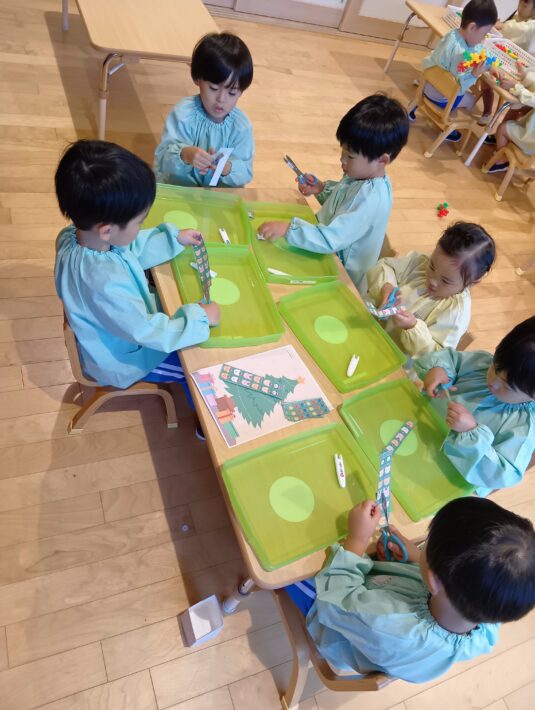 今月の指先遊び(ハサミ)は、クリスマスツリーを作りました🎄