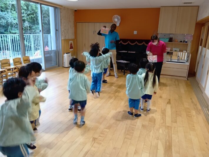 足踏みをしながら、絵カードの単語言い、「police car (パトカー)」が出たら気を付けをするゲームをしました。