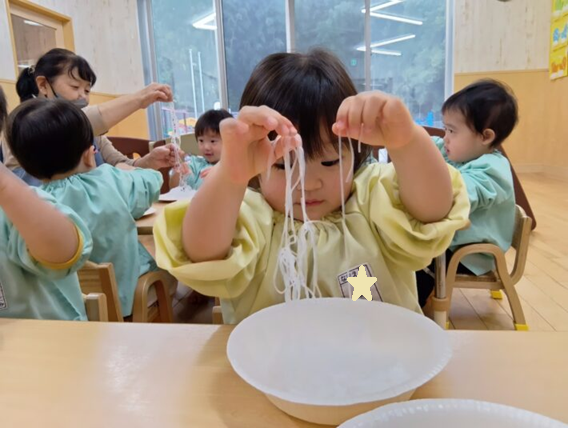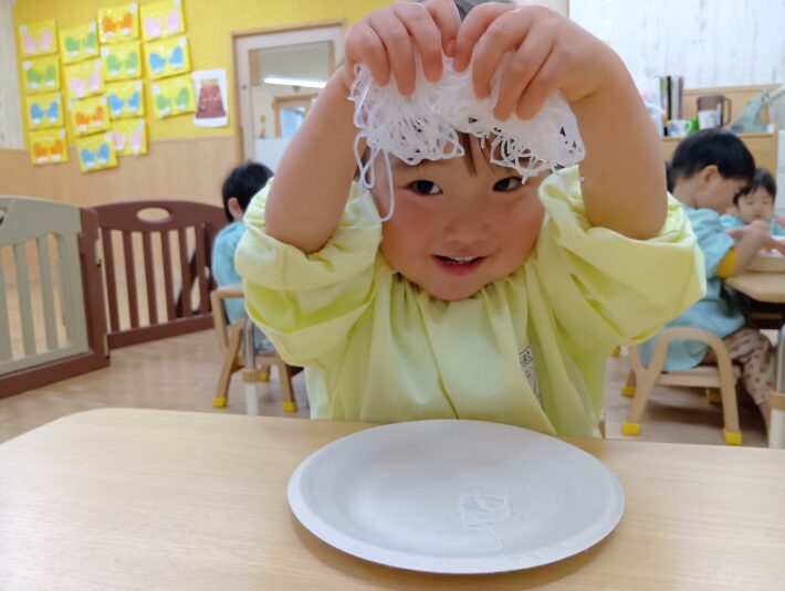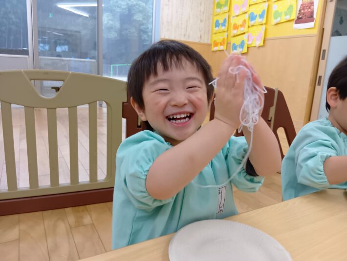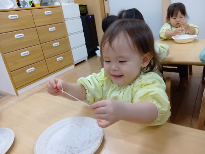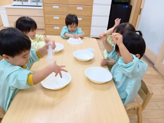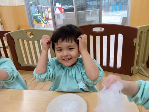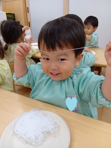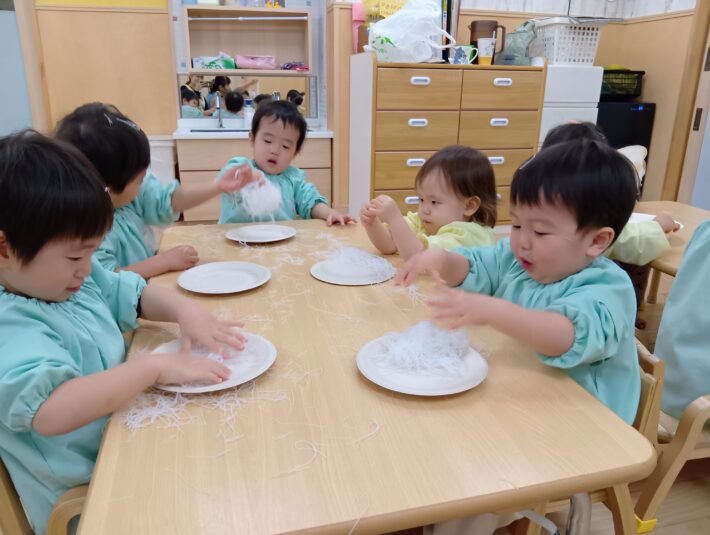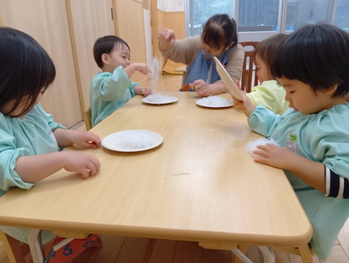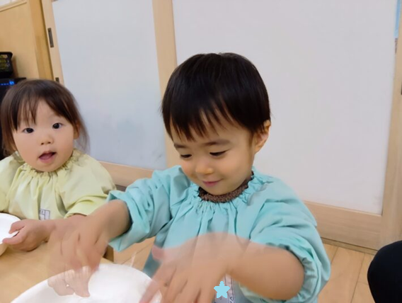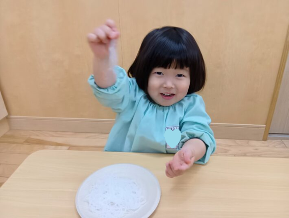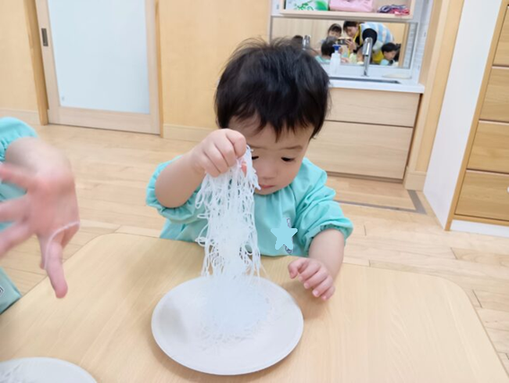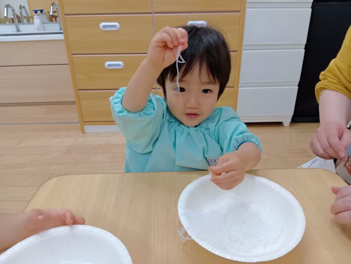2026年02月27日 はるさめ遊び🌷ちゅうりっぷ組 未満児 はるさめ遊びをしました!! 「これなーに?」と興味津々の子ども達でした!! 1人ずつお皿に入れて遊び始めると、固まりを持ち上げたり、ギュッと握って おにぎりを作ったり、ちぎったり、 はちまきのように頭に巻いたり、、、 それぞれ色々な遊び方を楽しんでいました(*^^*) 「つめたいー」「プニプニしてる」と言って感触を楽しみ、集中して遊んでいました\(^o^)/ << 前の記事へ 一覧へ