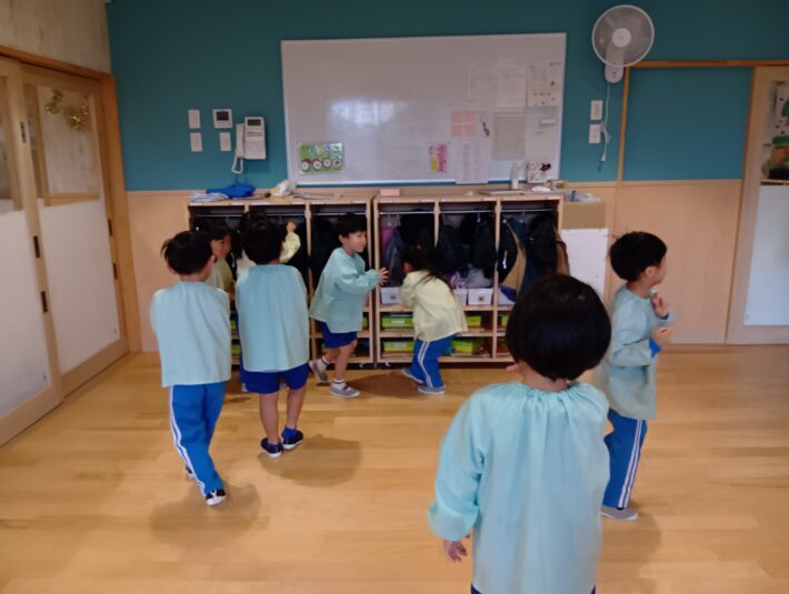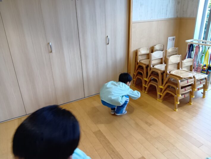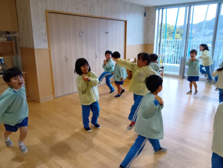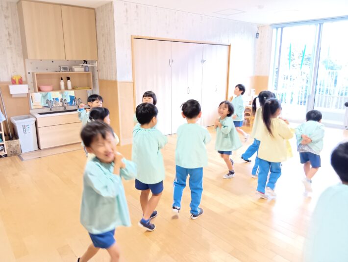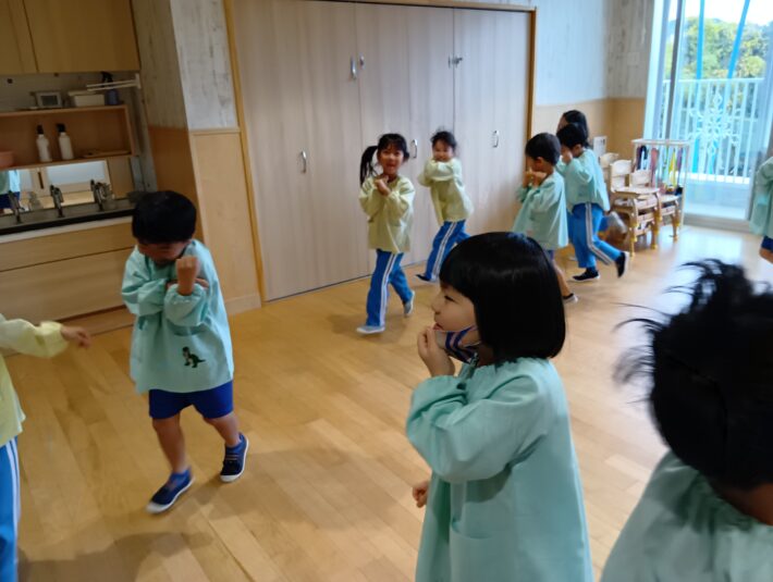 まずはサンタになりきり、ピアノの音に合わせた動きでプレゼントを配りました!