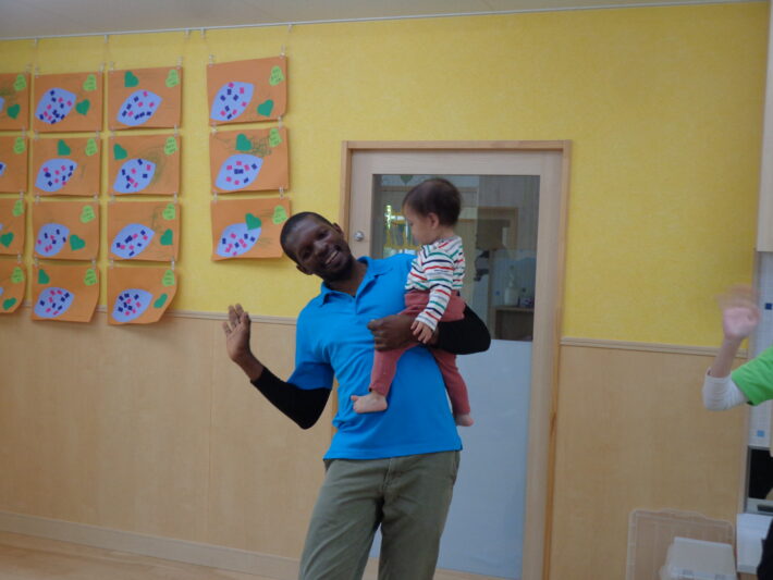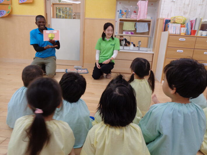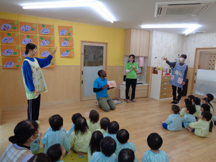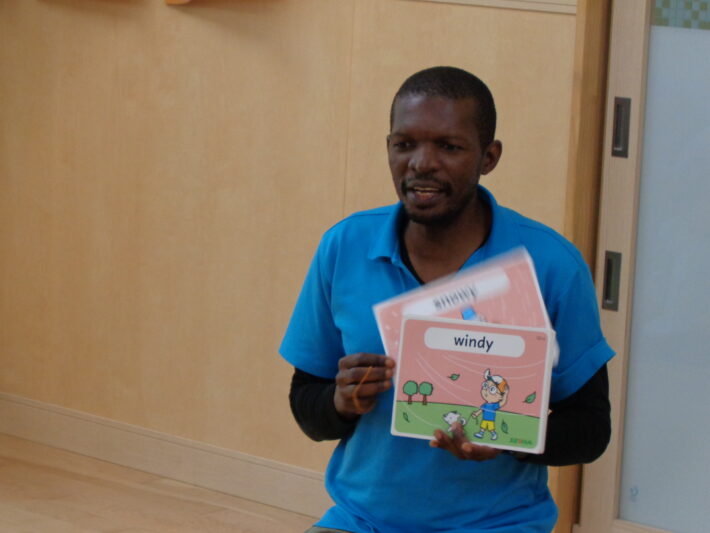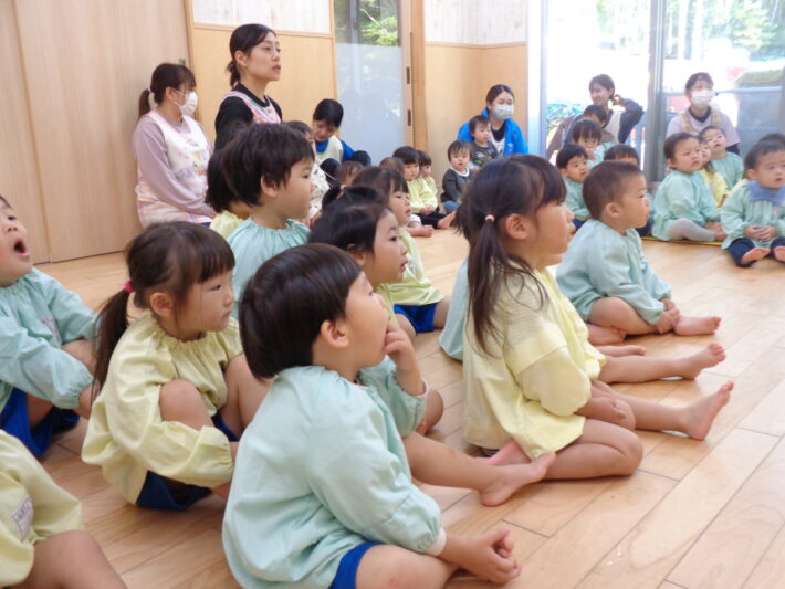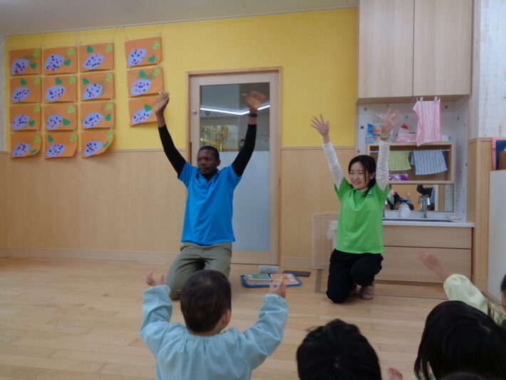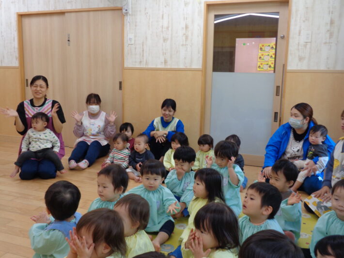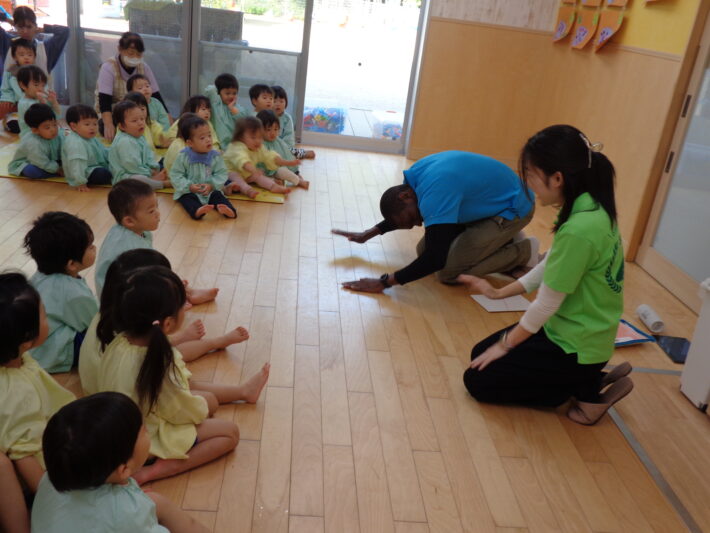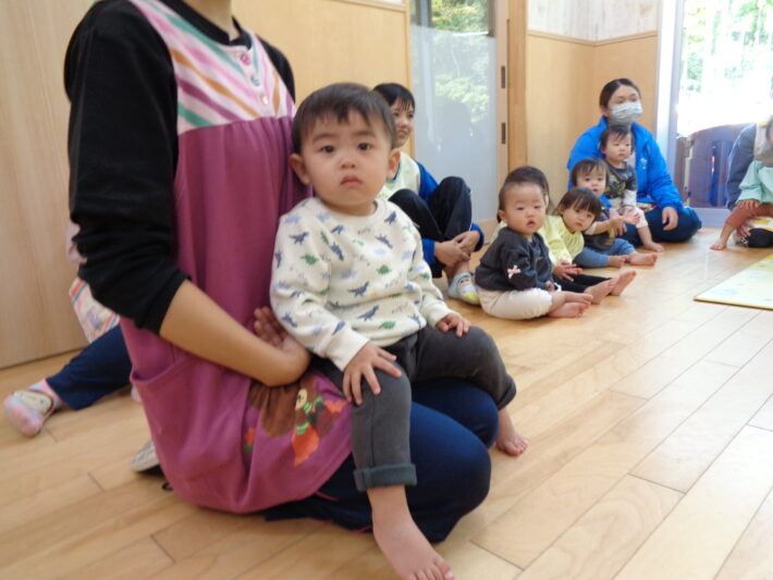 2025年11月25日 楽しいセイハ☆未満児 未満児 11月の最後のセイハに参加しました😊 英語の手遊び歌を上手に歌って踊っていたので「すごいね!上手だね!」と褒められて抱っこされ ると・・・びっくりして泣いてしまいました💦 次はお天気カードです(^^♪ みんな「ウィンディ!」と答えていました♪床をたたくと風が強くふいてきます☆ みんなサニフ先生の真似をしてよく見ています(^^♪ 次に動物カードをどちらがジャンケンで多くとるかの勝負です✌ + サニフ先生に挨拶してきましたよ♪ 今月も楽しい時間をありがとうございました! << 前の記事へ 一覧へ 次の記事へ >>