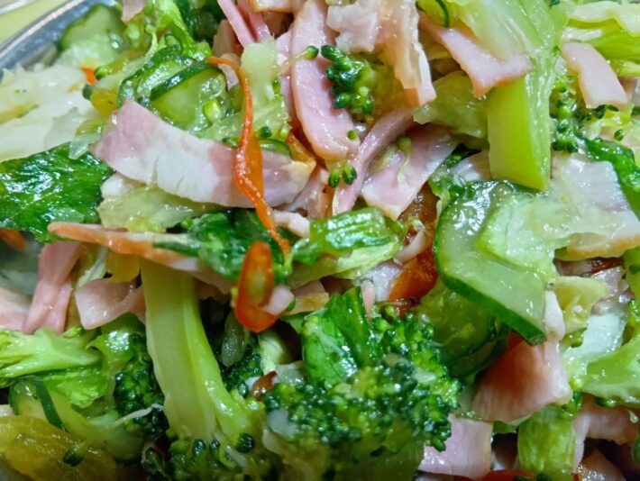 わいわいサラダ!!ブロッコリー・きゅうり・パプリカ・レタスにカリカリに焼いたベーコンをサラダにしています😊